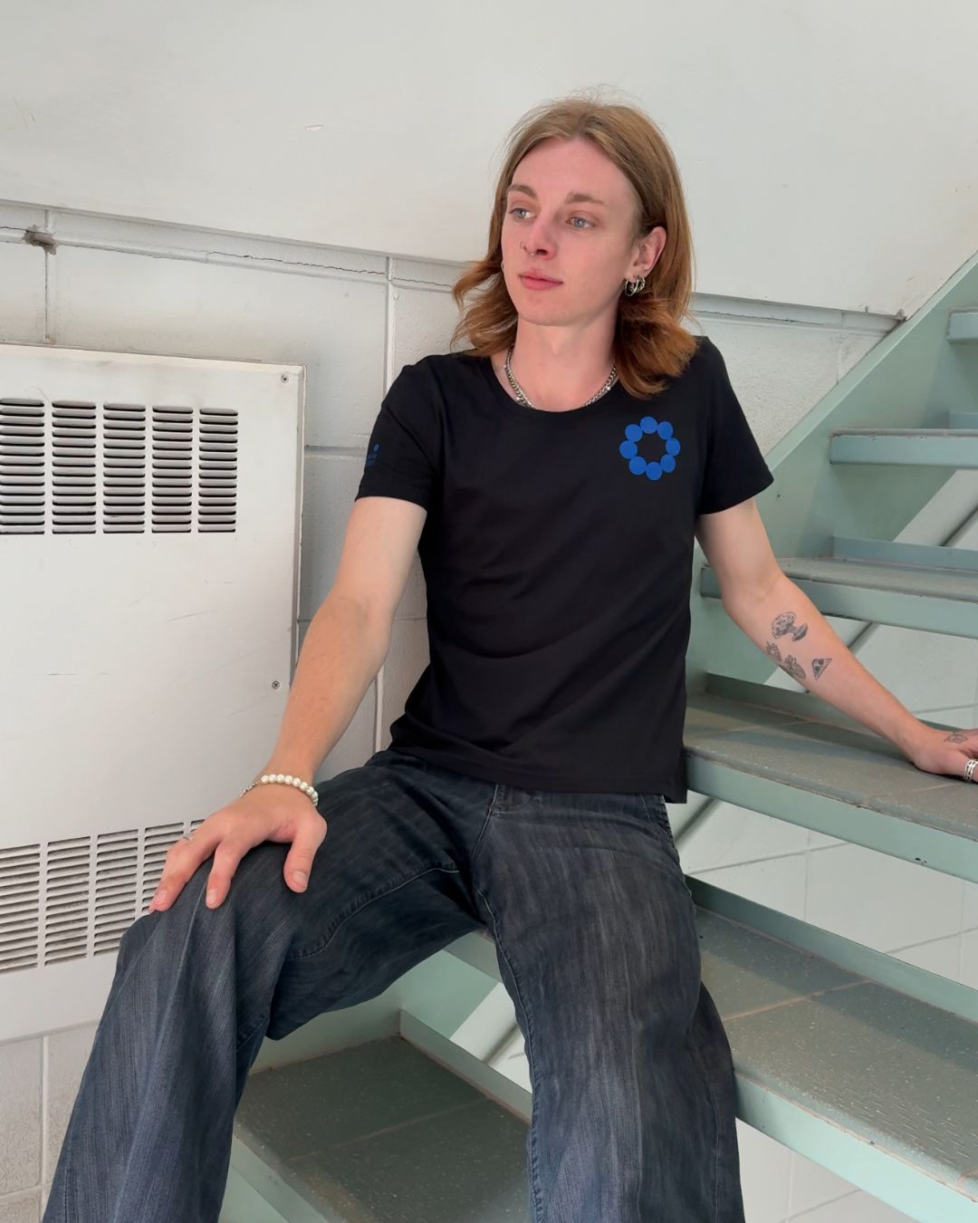 T-shirt noir orné de notre signature graphique de points bleus, évoquant une broche florale. Une référence subtile à l’univers de la joaillerie, transposée dans un vêtement pensé pour le quotidien. Coupe décontractée, facile à porter avec un jean.